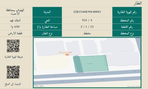 ▪︎ ارض ▪︎ رقم الارض 22 ▪︎ المساحة 650 م ▪︎ شارع 30 جنوباً ▪︎ الأطوال والأبعاد 25 × 25 ▪︎ على السوم ▪︎ رخصة فال 1200009258 موقع العقار
