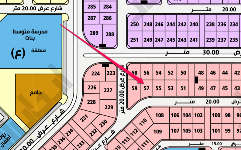 ▪︎ ارض ▪︎ رقم الارض 57 ▪︎ الحرف ط ▪︎ المساحة 738 م ▪︎ شارع 20 جنوباً ▪︎ السوم 350,000 ريال ▪︎ رخصة فال 1200009258 موقع العقار