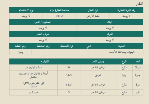 ▪︎ ارض ▪︎ رقم الارض بدون ▪︎ المساحة 301 م ▪︎ شارع 10 × 10 × 10 × مرفق ▪︎ السعر 400,000 ريال ▪︎ رخصة فال 1200009258 موقع العقار
