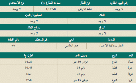 ▪︎ ارض ▪︎ رقم الارض 37 ▪︎ الحرف د ▪︎ المساحة 1,197 م ▪︎ شارع 30 × 15 ▪︎ السوم 500,000 ريال ▪︎ رخصة فال 1200009258 موقع العقار