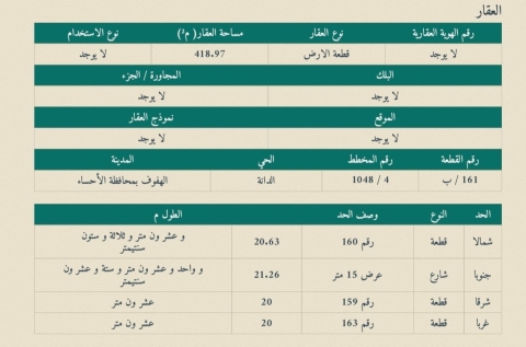 ▪︎ ارض ▪︎ رقم الارض 161 ▪︎ الحرف ب ▪︎ المساحة 419 م ▪︎ شارع 15 ▪︎ على السوم ▪︎ رخصة فال 1200009258 موقع العقار