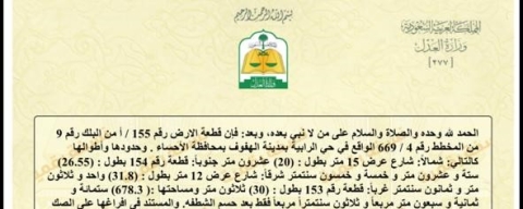 للبيع ارض في حي الرابية بالهفوف رقم 155/أ بلك 9 المساحة 678م شارع 15 × 12 بسعر 920 ريال للمتر