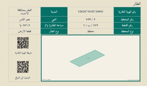▪︎ رقم الارض 519-1 ▪︎ الحرف ب ▪︎ المساحة 367 م ▪︎ شارع 15 شمالًا ▪︎ السعر 195,000 ريال ▪︎ رخصة فال 1200009258 96 views موقع العقار
