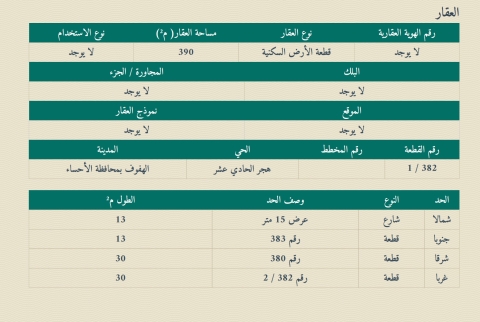 للبيع نصف ارض في الحي الحادي عشر بضاحية هجر رقم 382-1 المساحة 390م شارع 15 شمالًا السعر 205 الف حد