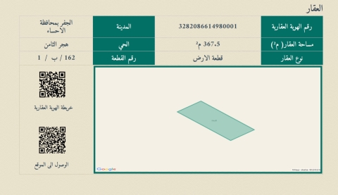 ▪︎ رقم الارض 162-1 ▪︎ الحرف ب ▪︎ المساحة 367 م ▪︎ شارع 15 ▪︎ السعر 200,000 ريال ▪︎ رخصة فال 1200009258 63 views موقع العقار
