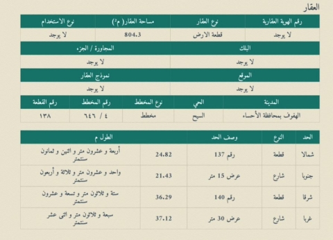 للبيع ارض في هجرة السيح رقم 138/ج المساحة 804م شارع 30 × 15 السعر 250 الف