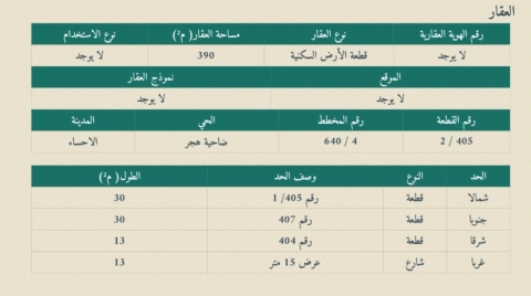 للبيع نصف ارض في الحي السابع بضاحية هجر رقم 405-2/أ المساحة 390م شارع 15 غربًا السعر 230 الف