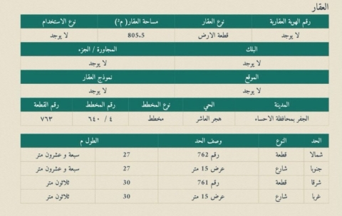 للبيع ارض في الحي العاشر بضاحية هجر رقم 763 المساحة 805م شارع 15 × 15 السوم 350 الف ريال