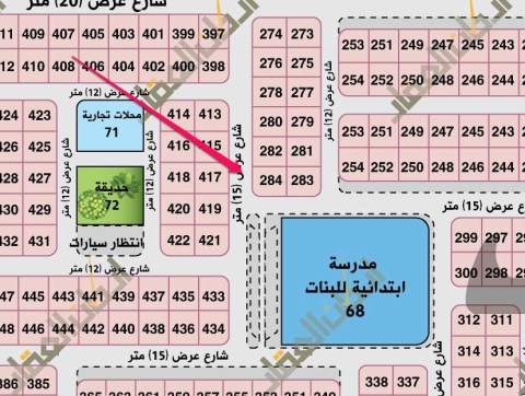 للبيع ارض في حي جنوب منسوب التعليم رقم 284/ب المساحة 395م شارع 15 × 15 على السوم