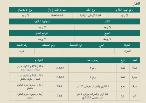 للبيع مزرعة صك في العمران بالقرب من بحيرة الاصفر المساحة 10000م السعر مليونين و 900 الف